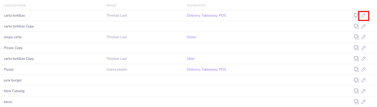 Haz clic en el icono Editar del Catálogo de donde quieres modificar la disponibilidad del producto.