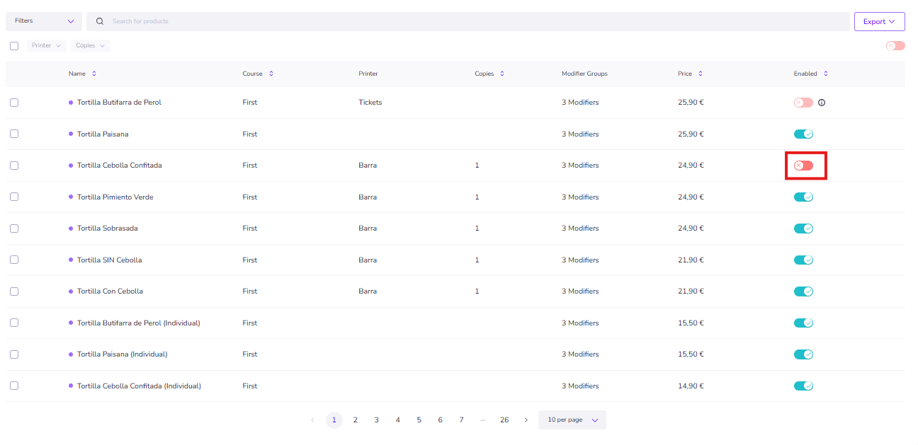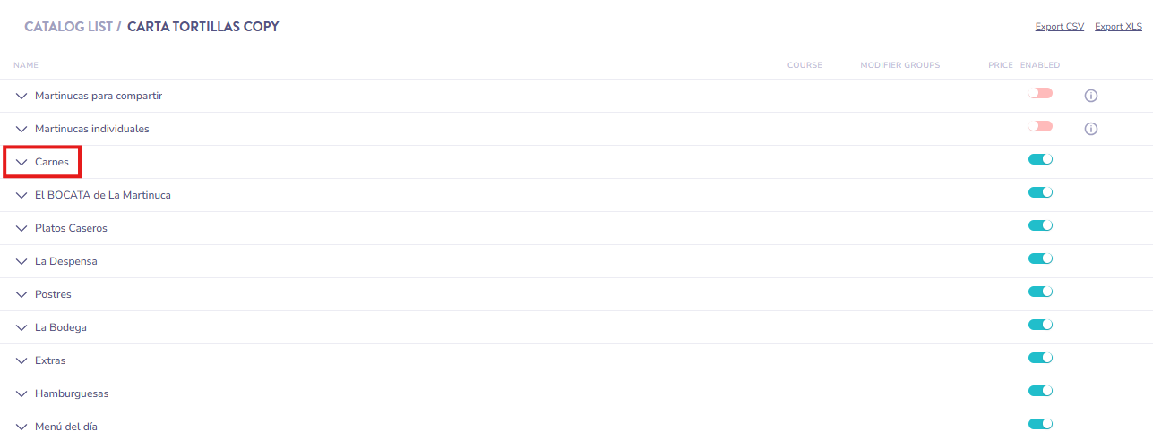 Haz clic en botón a la derecha del artículo para Activar o Desactivar el mismo.