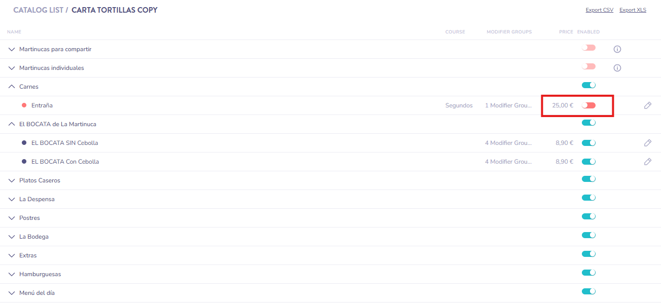 En LastPOS ofrecemos la posibilidad de activar o desactivar un artículo o producto de un catálogo o de varios, lo que puede resultar muy útil. Ya sea que un producto se ha agotado o queremos delimitar su disponibilidad a uno o más catálogos, por ejemplo: Solo disponible para Delivery o Solo disponible para el Restaurante.