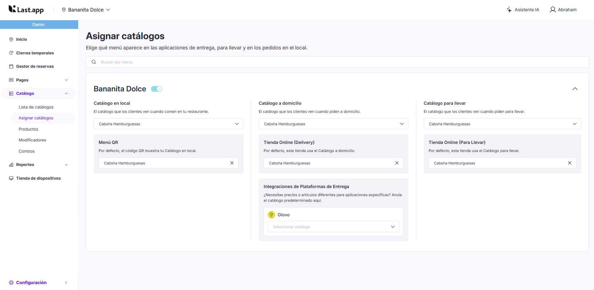 Si quieres usar uno diferente para cada empresa de delivery, Podrás asignar un catálogo a cada una de las plataformas integradas con tu marca por ejemplo JustEat, Glovo, Uber..