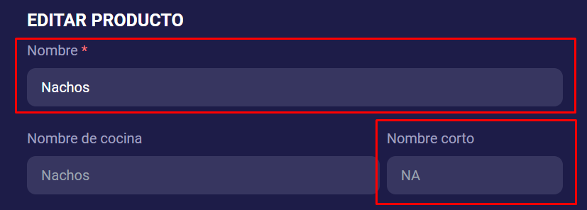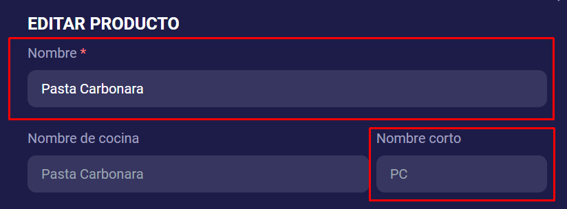 Nombre de cocina: Aparece solo en cocina. Útil si el nombre comercial es largo (ej. “Lomo hierbas” en lugar de “Lomo de ternera a las finas hierbas”).