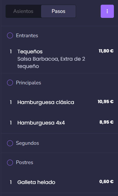 Configurar un tipo de plato hará que el producto se categorice automáticamente en el TPV cuando se comande (como se ve en la imagen de abajo), lo que es bastante útil si usas un menú por pasos y deseas enviar notas a cocina para marchar los diferentes pasos de una comanda.
