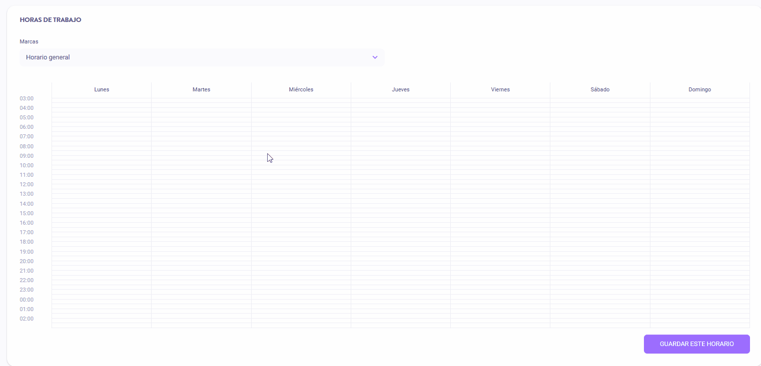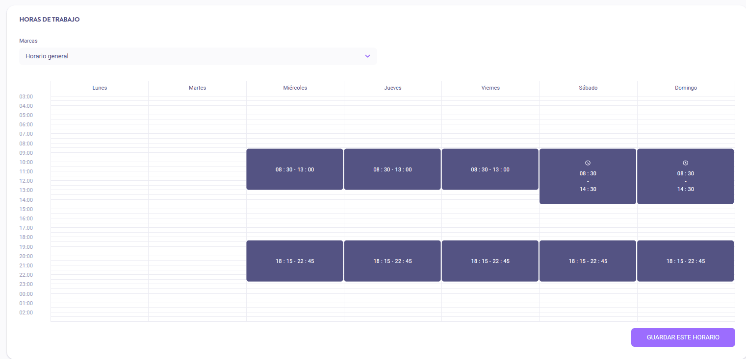 El horario general se aplicará a todas las marcas de la ubicación, a menos que configures un horario específico por marca.