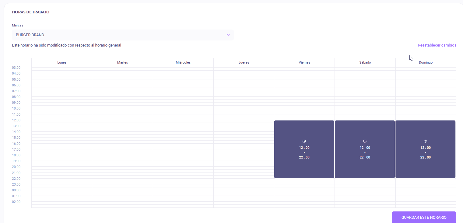 Si ves la opción “Reestablecer cambios”, eso significa que el sistema detecta una diferencia entre el horario general y el horario de esa marca.