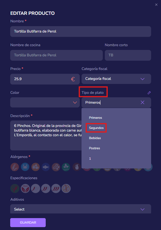 Haz clic en el selector de "Tipo de plato".