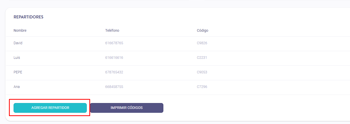Ejemplo de códigos de repartidores