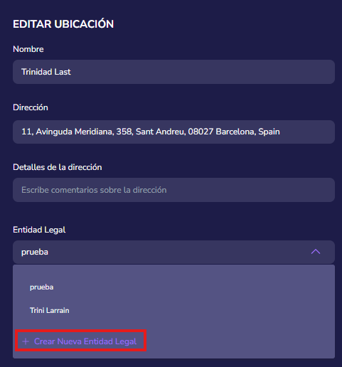 En el campo Entidad Legal, selecciona “Crear nueva entidad legal”.