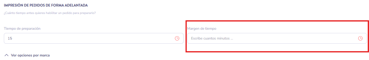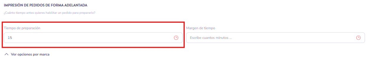 Si el tiempo de preparación es de 15 minutos pero queremos que el pedido se imprima1 hora antes, añadiremos en este campo el valor "60".