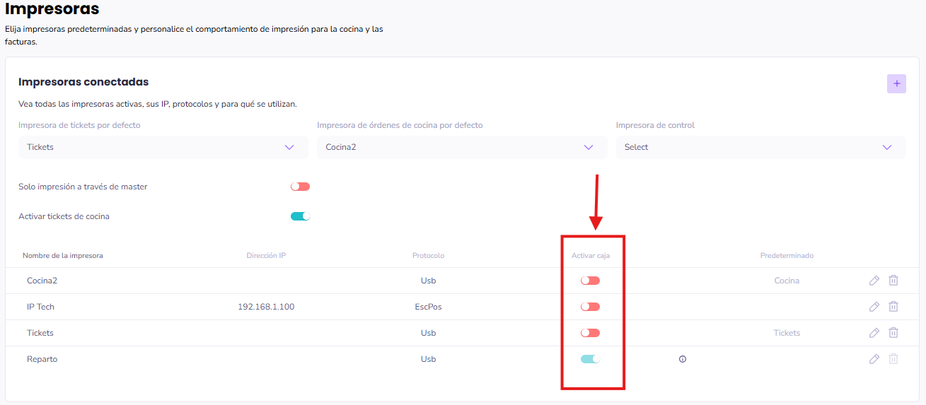 Activa el conmutador "Activar caja" en la impresora correspondiente.