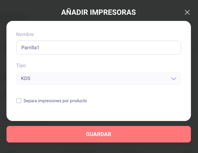 Por cada dispositivo KDS en Fresh, debes crear una impresora virtual en Last.app con las siguientes características: