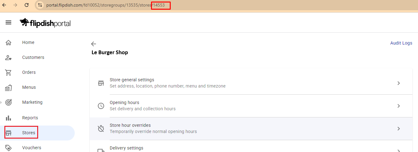 Para ello debes acceder a tu portal de Flipdish y entrar en la tienda que deseas integrar. Una vez dentro de la tienda deseada en la URL verás el código de la tienda o "Store ID" que debes agregar en Last Admin para realizar la integración.