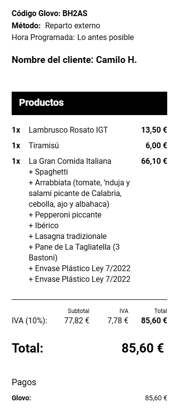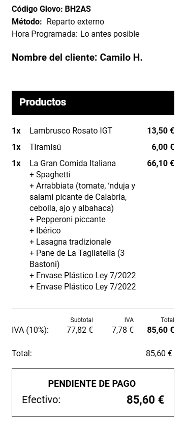 Ejemplo de un ticket pagado por GlovoEjemplo de un ticket de Glovo pendiente de pago en efectivo/tarjeta