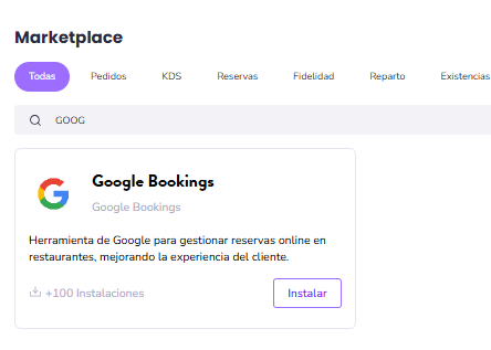 Ve a Integraciones y en el buscador de Marketplace busca Google Bookings.
