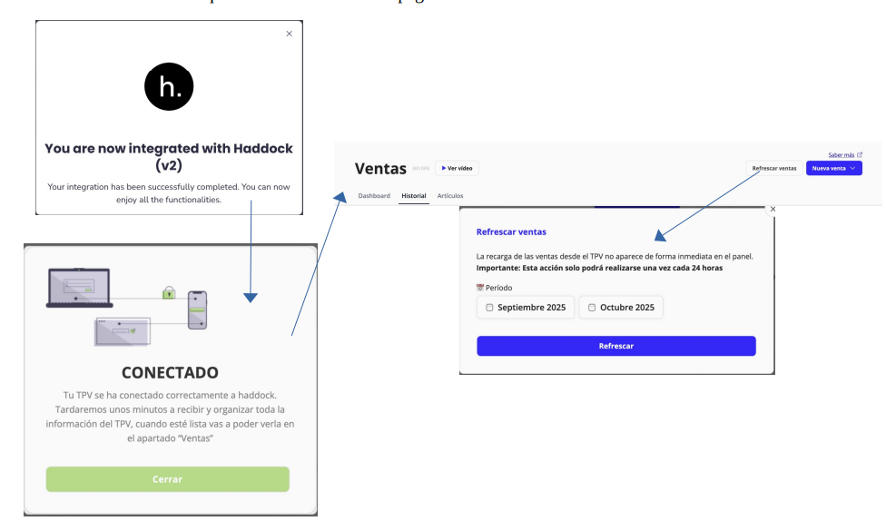 Cuando la integración esté activa, podrás actualizar tus ventas desde Haddock. Ten en cuenta que el proceso puede tardar unos minutos, por lo que se recomienda refrescar la página periódicamente hasta que los datos se sincronicen correctamente.