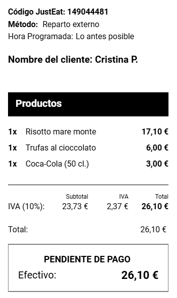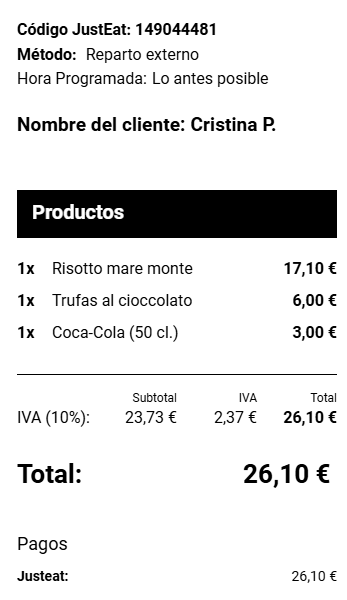Cuando un cliente realiza un pedido en tu tienda de JustEat, Last.app recibe automáticamente los siguientes datos: