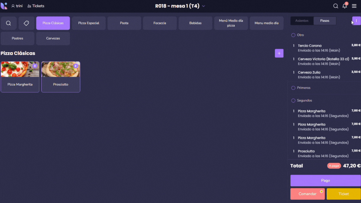 Selecciona productos y asígnales (de forma manual o ya programada) un Paso: Primeros, Segundos, Postres etc... .