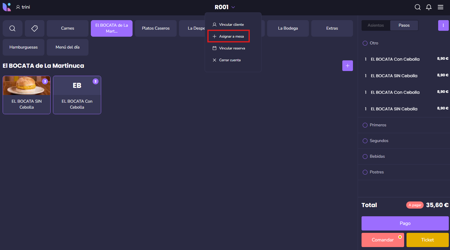 Pulsa en los tres puntos arriba junto al nombre de la mesa/cuenta, y selecciona "Asignar a mesa"