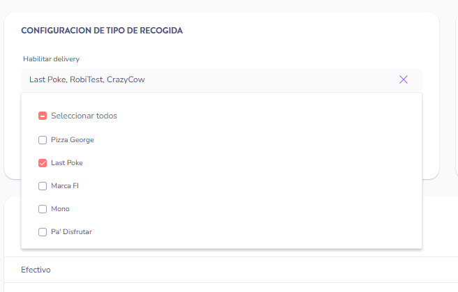En la sección de configuración, asigna las marcas que estarán habilitadas para Delivery y/o Take Away.