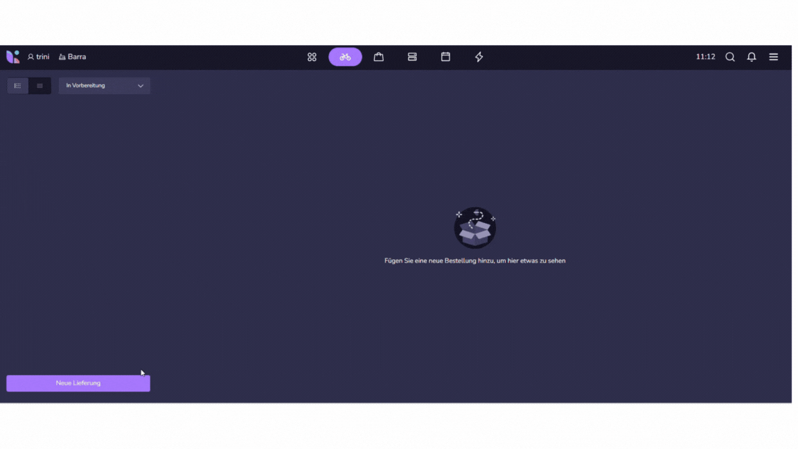 Gehe zum Bereich "Delivery", erkennbar am Motorradsymbol in der oberen Leiste.