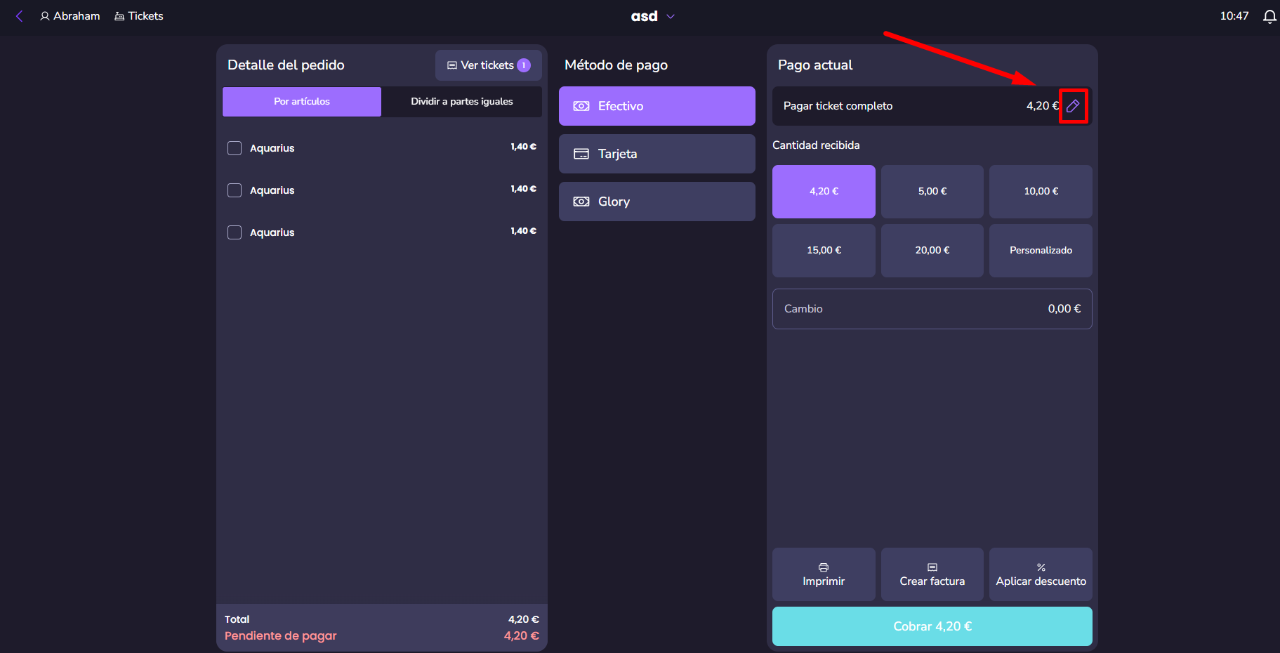 Una vez en la cuenta, verás los botones de "Efectivo", "Tarjeta"