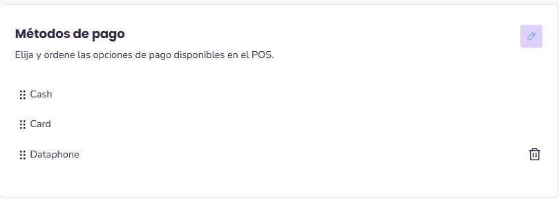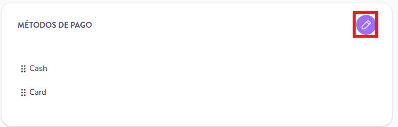 4.  Si deseas cambiar el orden de los métodos de pago, puedes hacer clic sobre el método y deslizarlo hacia arriba.