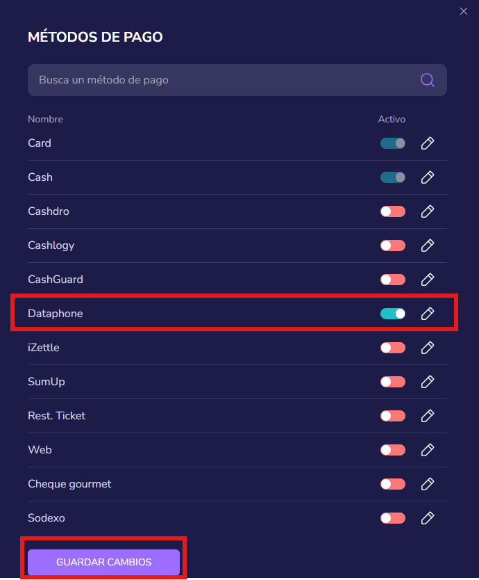 2.  Activamos el método de pago Dataphone y guardamos los cambios: