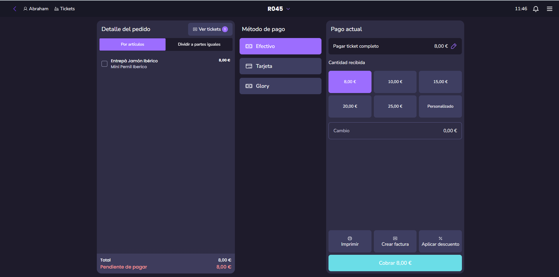 Este botón te guiará al pago avanzado. En él podrás dividir cuentas, realizar pagos específicos de productos o agregar descuentos. Una vez realices los pagos de la cuenta, esta se cerrará imprimiendo su ticket correspondiente y enviando las comandas a cocina.