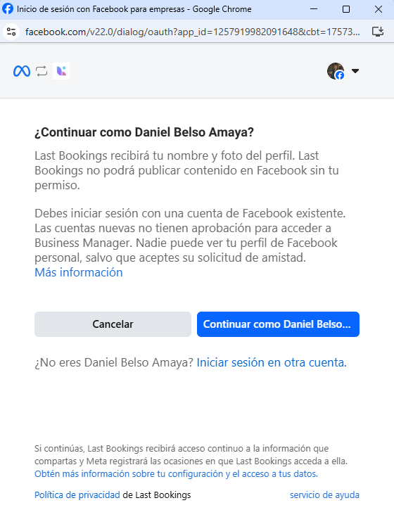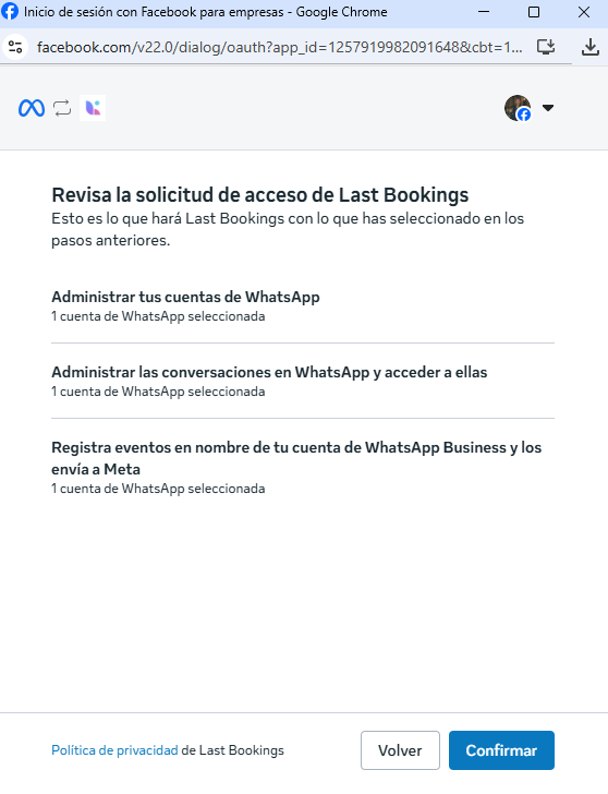 Rellenamos la información de la empresa (vuestro restaurante) y creamos o seleccionamos la cuenta de Whatsapp Business.